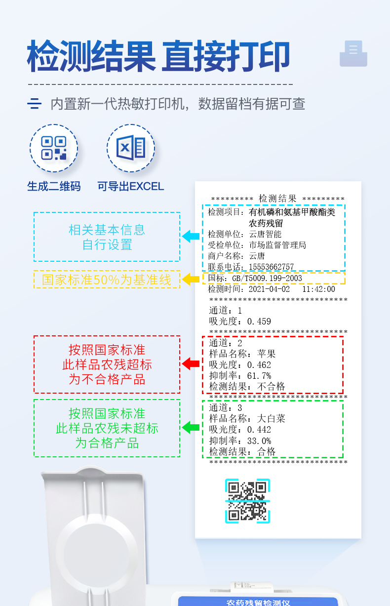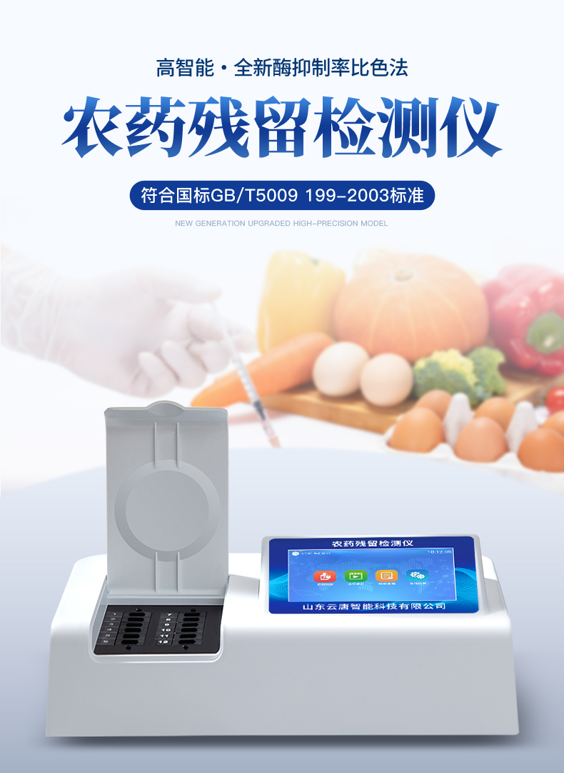 檢測(cè)標(biāo)準(zhǔn):依據(jù)國(guó)家標(biāo)準(zhǔn)方法(GB/T5009.199-2003)以及世界衛(wèi)生組織WHO、世界糧農(nóng)組織FAO殘留農(nóng)藥檢測(cè)標(biāo)準(zhǔn)、世界環(huán)境保護(hù)局EPA參照攝入量等要求來(lái)設(shè)計(jì)。采用酶抑制率比色法對(duì)水果、蔬菜等農(nóng)林產(chǎn)品中有機(jī)磷和氨基甲酸酯類(lèi)農(nóng)藥含量進(jìn)行快速準(zhǔn)確的檢測(cè)。