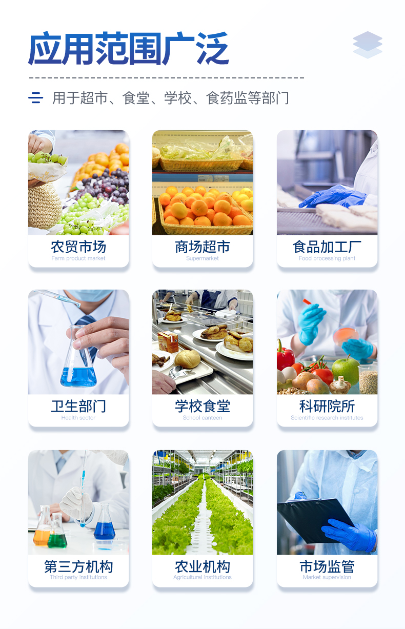 廣泛應(yīng)用于主要用于蔬菜、水果、茶葉、糧食、農(nóng)副產(chǎn)品等食品中有機(jī)磷和氨基甲酸酯類(lèi)農(nóng)藥殘留的快速檢測(cè);此外還可用于果蔬茶生產(chǎn)基地和農(nóng)貿(mào)批發(fā)銷(xiāo)售市場(chǎng)現(xiàn)場(chǎng)檢測(cè),餐館、學(xué)校、食堂、家庭果蔬加工前的安全速測(cè)等。