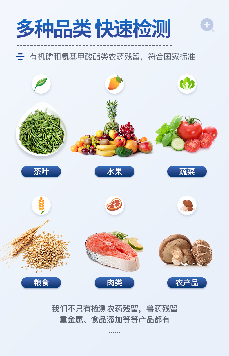 檢測(cè)標(biāo)準(zhǔn):依據(jù)國(guó)家標(biāo)準(zhǔn)方法(GB/T5009.199-2003)以及世界衛(wèi)生組織WHO、世界糧農(nóng)組織FAO殘留農(nóng)藥檢測(cè)標(biāo)準(zhǔn)、世界環(huán)境保護(hù)局EPA參照攝入量等要求來(lái)設(shè)計(jì)。采用酶抑制率比色法對(duì)水果、蔬菜等農(nóng)林產(chǎn)品中有機(jī)磷和氨基甲酸酯類農(nóng)藥含量進(jìn)行快速準(zhǔn)確的檢測(cè)。