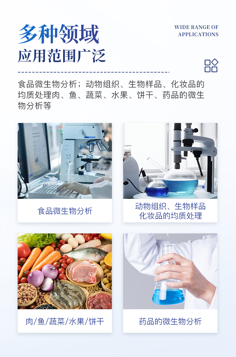 應(yīng)用領(lǐng)域:食品微生物分析;動(dòng)物組織、生物樣品、化妝品的均質(zhì)處理;肉、魚、蔬菜、水果、餅干;藥品的微生物分析等;