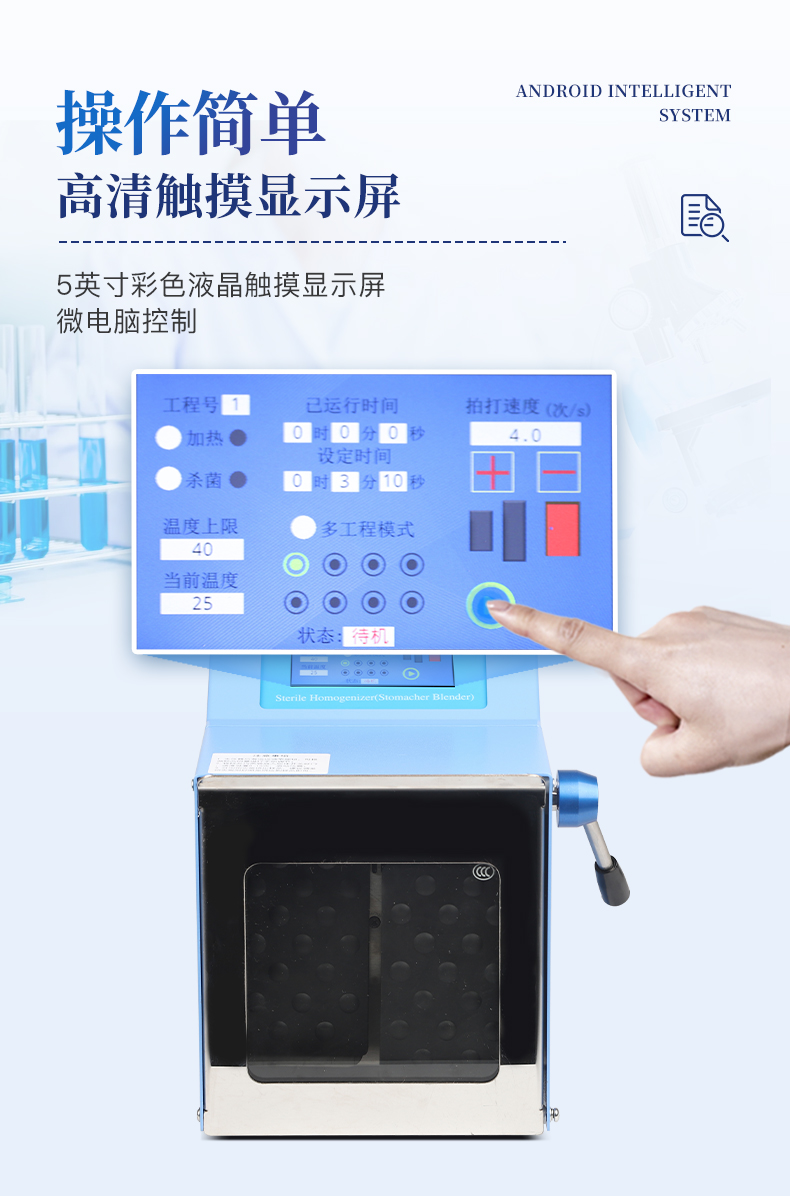 無菌均質(zhì)器使從固體樣品中提取細(xì)菌的過程變得非常簡單,只需將樣品和稀釋液加入到無菌的樣品袋中,然后將樣品袋放入拍擊式均質(zhì)器中即可完成樣品的處理。有效地分離被包含在固體樣品內(nèi)部和表面的微生物均一樣品,確保無菌袋中混合全部的樣品。處理后的樣品溶液可以直接進(jìn)行取樣和分析,沒有樣品的變化和交叉污染的危險(xiǎn)。