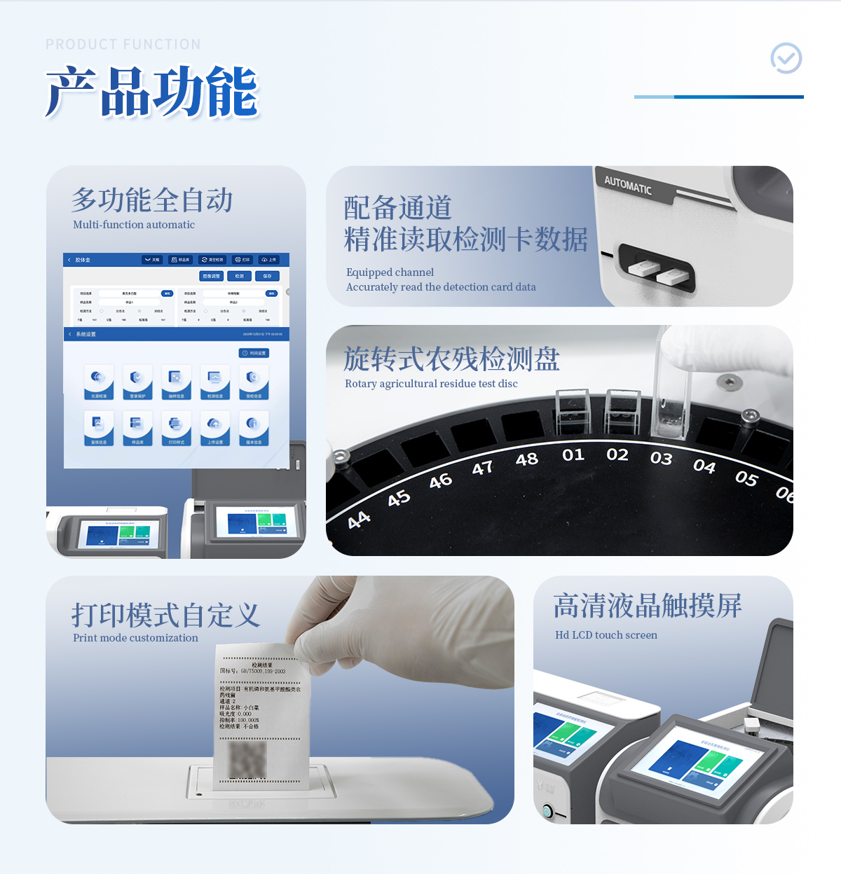 | 1. 試劑位置:3個(gè) | 2. 農(nóng)殘檢測(cè)盤:旋轉(zhuǎn)24通道比色盤,可任意選擇檢測(cè)通道,自動(dòng)對(duì)應(yīng)選擇通道。 | 3. 膠體金通道:2個(gè),可讀取檢測(cè)卡結(jié)果,自動(dòng)采集、處理分析,自動(dòng)判斷檢測(cè)結(jié)果,并具備自動(dòng)判空功能。 | 4.系統(tǒng)配置:10.1寸高清液晶觸摸屏,采用ARM Cortex?-A7,RK3288/4核處理器,運(yùn)行內(nèi)存1GB。Android7.1.1 系統(tǒng)分辨率1280×800。 | 5.恒溫系統(tǒng):具有自動(dòng)加溫溫控系統(tǒng),精準(zhǔn)恒溫37℃,精度±0.1℃。 | 6.添加系統(tǒng):儀器按照試劑要求自動(dòng)、按時(shí)、按量加入試劑,并且自動(dòng)對(duì)未正常放置的樣本或異常的樣本進(jìn)行檢查并提示。 | 7.清洗功能:儀器具備回流及自動(dòng)清洗管路功能,避免試劑污染。 | 8.混勻功能:設(shè)備具備自動(dòng)混勻功能。 | 9.光源校準(zhǔn):設(shè)備可自動(dòng)校準(zhǔn),確保檢測(cè)準(zhǔn)確度。 | 10.實(shí)時(shí)監(jiān)控:儀器測(cè)試過(guò)程中屏幕顯示運(yùn)行狀態(tài),可實(shí)時(shí)查看。 | 11.數(shù)據(jù)存儲(chǔ):內(nèi)部存儲(chǔ)16GB,可存儲(chǔ)500萬(wàn)條數(shù)據(jù)。 | 12.樣品多選功能:設(shè)備具備樣品一鍵多選功能,選擇樣品自動(dòng)匹配檢測(cè)通道。 | 13.項(xiàng)目預(yù)設(shè):可提前設(shè)置單個(gè)及多個(gè)相同或不相同的檢測(cè)任務(wù),可單次或者多次調(diào)取,減少檢測(cè)時(shí)間。 | 14.自定義打印系統(tǒng):內(nèi)置自定義打印系統(tǒng),可按需靈活設(shè)置開(kāi)啟或關(guān)閉:產(chǎn)品合格證(國(guó)家農(nóng)業(yè)部標(biāo)準(zhǔn)),二維碼,抽樣信息、檢測(cè)信息,受檢信息等信息的打印。 | 15.A4版本報(bào)告打印功能:設(shè)備可自動(dòng)生成A4版報(bào)告,A4報(bào)告帶二維碼,可掃描二維碼生成電子版,并可識(shí)別真?zhèn)巍?/td> | 16.傳輸方式:儀器配備無(wú)線通信模塊: 4G(APN)通訊模塊、Wifi模塊,藍(lán)牙傳輸模塊,同時(shí)具有USB接口以及RJ45接口能以多種方式實(shí)現(xiàn)數(shù)據(jù)保存和數(shù)據(jù)傳輸功能,設(shè)備數(shù)據(jù)可以同步上傳至平臺(tái)。 | 17.系統(tǒng)17.數(shù)據(jù)監(jiān)管系統(tǒng):設(shè)備自帶監(jiān)管平臺(tái),并可同步對(duì)接監(jiān)管平臺(tái),數(shù)據(jù)可局域網(wǎng)和互聯(lián)網(wǎng)數(shù)據(jù)上傳,檢測(cè)結(jié)果可直接傳至食品安全監(jiān)管平臺(tái)。達(dá)到食品安全問(wèn)題預(yù)估、預(yù)警。 | 18.系統(tǒng)遠(yuǎn)程更新功能:無(wú)需設(shè)備返廠,即可遠(yuǎn)程實(shí)時(shí)升級(jí)全新系統(tǒng),節(jié)省時(shí)間成本及避免運(yùn)輸造成設(shè)備損。 |