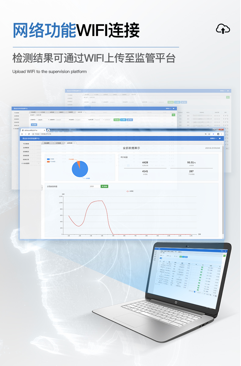 12、儀器具有 wifi 聯(lián)網(wǎng)上傳、RJ45網(wǎng)線連接功能,可以快速上傳數(shù)據(jù)。同步對接監(jiān)管平臺,數(shù)據(jù)可局域網(wǎng)和互聯(lián)網(wǎng)數(shù)據(jù)上傳,檢測結(jié)果直接傳至食品安全監(jiān)管平臺。進(jìn)行區(qū)域食品安全監(jiān)管及大數(shù)據(jù)分析處理與數(shù)據(jù)統(tǒng)計(jì),檢測區(qū)域食品安全長短期動態(tài),達(dá)到食品安全問題預(yù)估、預(yù)警。
