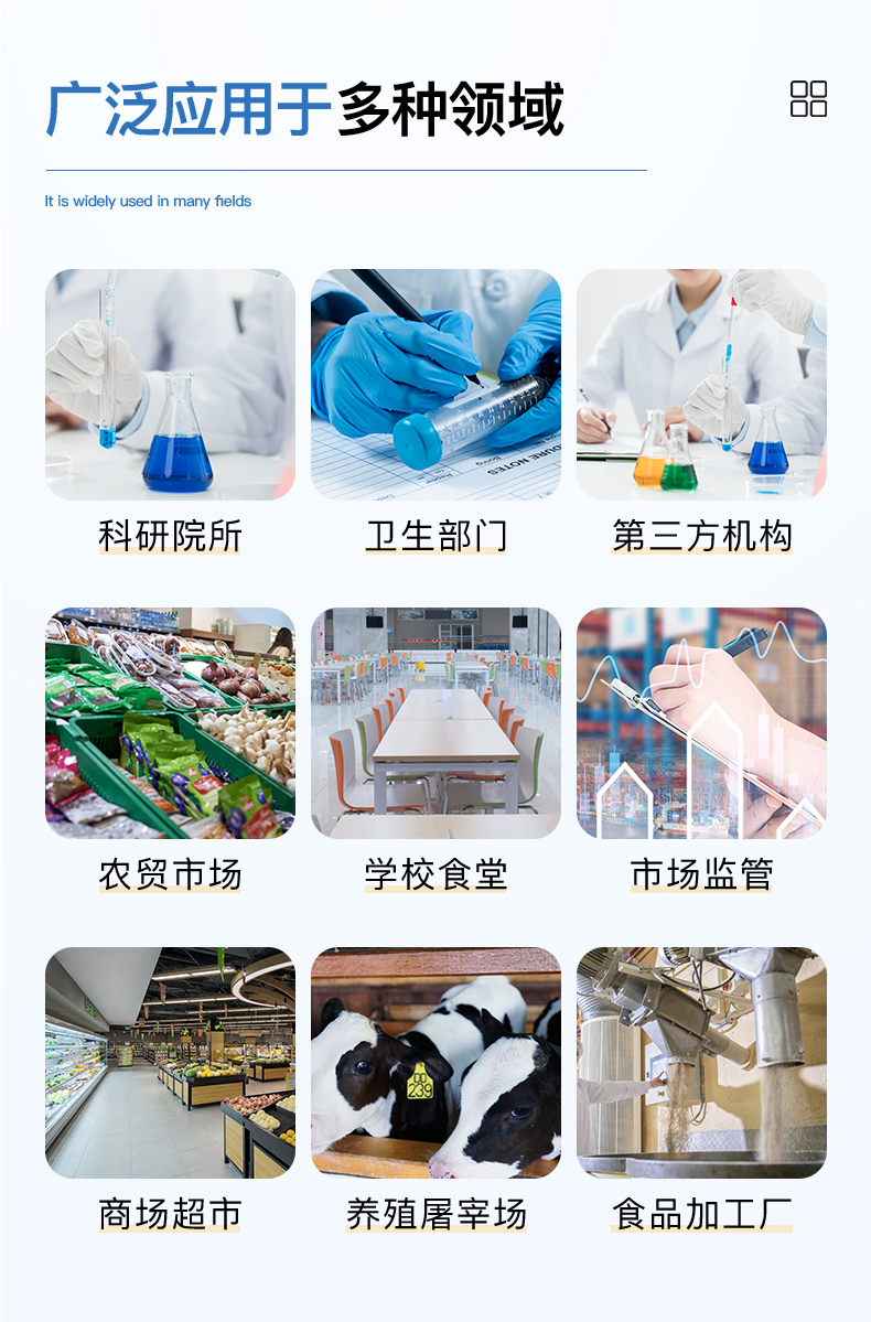 3、瓜果蔬菜藥殘:農(nóng)藥殘留(酶抑制率法)、多菌靈、百菌清、毒死蜱、克百威、啶蟲脒、甲萘威、甲氰菊酯、異丙威、氟蟲腈、聯(lián)苯菊酯、阿維菌素、噻蟲嗪、吡蟲啉、殺螟硫磷、百草枯、無根水(豆芽)、6-芐氨基嘌呤(豆芽)等;