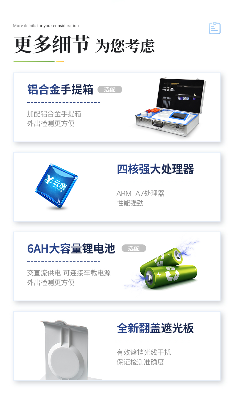 2、儀器檢測模塊標(biāo)準(zhǔn)化、智能化,檢測項(xiàng)目可隨意自由組合。檢測箱體內(nèi)置多個(gè)標(biāo)準(zhǔn)檢測單元,檢測模塊可以調(diào)整配置。