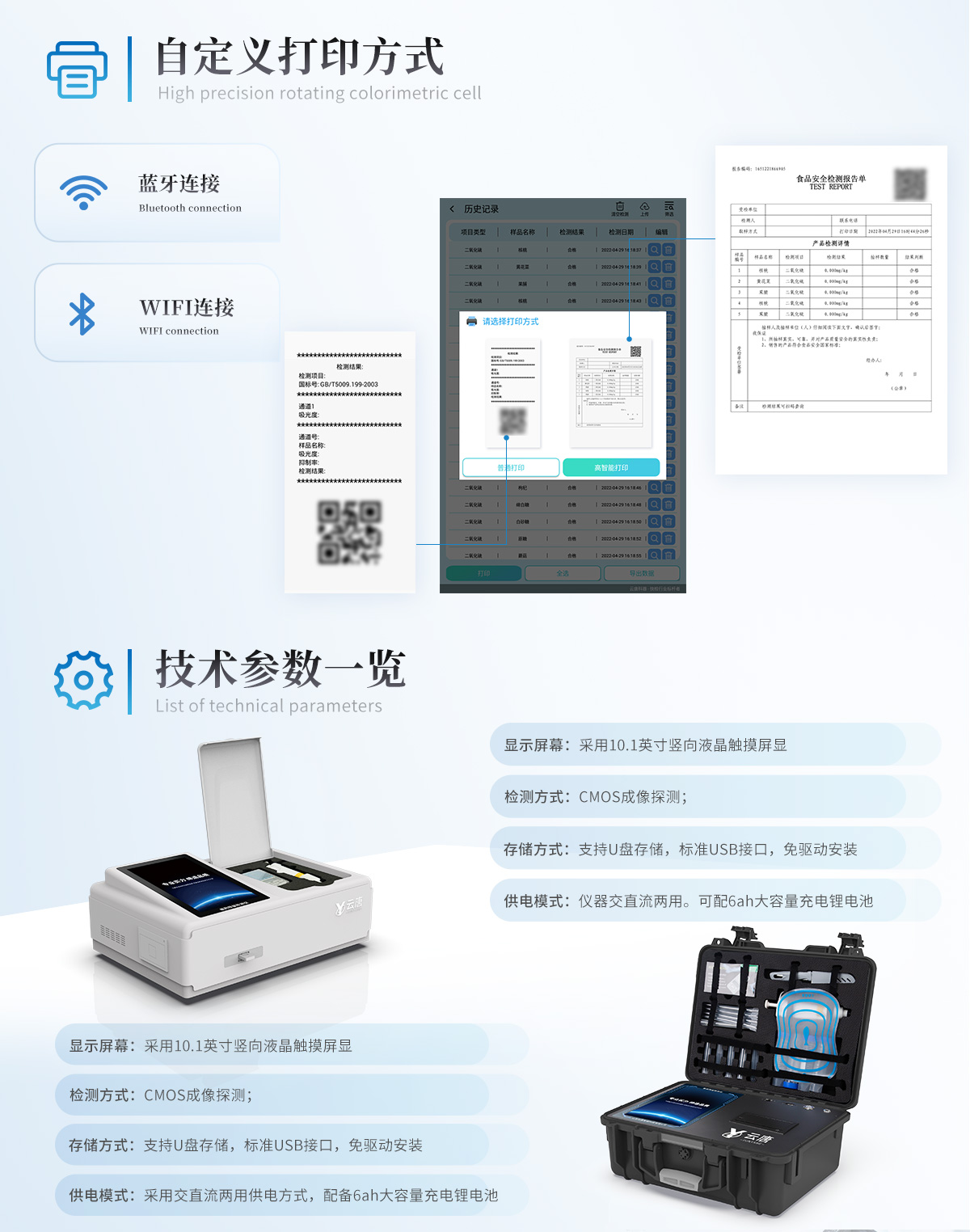 10、儀器具有 wifi 聯(lián)網(wǎng)上傳、RJ45網(wǎng)線連接功能,可以快速上傳數(shù)據(jù)。同步對接監(jiān)管平臺,數(shù)據(jù)可局域網(wǎng)和互聯(lián)網(wǎng)數(shù)據(jù)上傳,檢測結(jié)果直接傳至食品安全監(jiān)管平臺。進行區(qū)域食品安全監(jiān)管及大數(shù)據(jù)分析處理與數(shù)據(jù)統(tǒng)計,檢測區(qū)域食品安全長短期動態(tài),達到食品安全問題預估、預警。