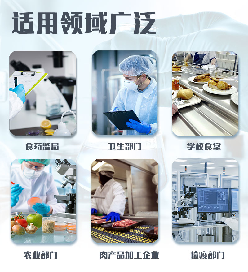 該多功能食品安全檢測儀為集成一體化食品安全快速檢測分析設(shè)備,廣泛應(yīng)用于食藥監(jiān)局、衛(wèi)生部門、高教院校、科研院所、農(nóng)業(yè)部門、養(yǎng)殖場、屠宰場、食品肉產(chǎn)品深加工企業(yè)、檢驗檢疫部門等單位使用。