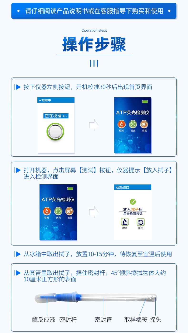 該設(shè)備為全新升級(jí)產(chǎn)品,大屏幕觸摸顯示屏,代替?zhèn)鹘y(tǒng)按鍵。操作采用生物化學(xué)反應(yīng)方法檢測ATP含量,ATP熒光檢測儀基于螢火蟲發(fā)光原理,利用“熒光素酶—熒光素體系”快速檢測三磷酸腺苷(ATP)。ATP拭子含有可以裂解細(xì)胞膜的試劑,能將細(xì)胞內(nèi)ATP釋放出來,與試劑中含有的特異性酶發(fā)生反應(yīng),產(chǎn)生光,再用熒光照度計(jì)檢測發(fā)光值,微生物的數(shù)量與發(fā)光值成正比,由于所有生物活細(xì)胞中含有恒量的ATP,所以ATP含量可以清晰地表明樣品中微生物與其他生物殘余的多少,用于判斷衛(wèi)生狀況。