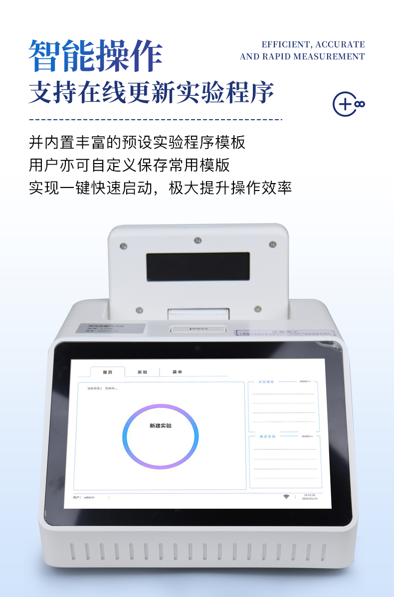 | 1.智能操作系統(tǒng),實驗盡在掌握 | A程序更新與預設:支持在線更新實驗程序,并內置豐富的預設實驗程序模板,用戶亦可自定義保存常用模版,實現(xiàn)一鍵快速啟動,極大提升操作效率。 | B操作簡單:無論是觸摸屏界面還是電腦軟件,均設計得直觀易懂,新用戶也能快速上手。預置常用程序模板,進一步簡化操作流程。 | 2.精準穩(wěn)定的溫控與光學核心 | A長久精準的溫控系統(tǒng):采用進口***TEC半導體制冷模塊,控溫精準(±0.1°C),孔間溫度均勻性**(≤±0.3°C)。系統(tǒng)穩(wěn)定性卓越,長期使用性能衰減小,校準周期長達數(shù)年,顯著降低維護成本與運營中斷。 | B免維護的靈敏光學系統(tǒng):配備單個獨立LED光源與單個獨立光電二極管檢測器,采用超長壽命進口光源,設計壽命期內免維護,無需額外校準或更換,保障檢測結果長期一致性與高靈敏度。 | C卓越的數(shù)據(jù)質量:實驗線性相關性高(R2≥0.999),重復性優(yōu)異(孔間CV值低),確保定量結果準確可靠,數(shù)據(jù)置信度高。 | 3.**便捷的數(shù)據(jù)與輸出管理 | A多重數(shù)據(jù)導出方式:支持通過USB存儲設備直接拷貝,或經(jīng)由Wi-Fi無線網(wǎng)絡傳輸數(shù)據(jù)至本地服務器或云端,方便靈活,滿足各類實驗室數(shù)據(jù)管理習慣。 | B豐富的報告導出與打印:支持生成并導出多種格式(如PDF、Excel)的實驗報告。儀器兼容USB熱敏打印機、藍牙無線打印機及常規(guī)A4打印機,可直接在儀器上或通過電腦一鍵導出并打印專業(yè)報告,便于結果存檔與即時分享。 | 4.快速**與堅固耐用 | A升降溫速度快:優(yōu)化設計的溫控系統(tǒng)具備高速升降溫能力,顯著縮短單次循環(huán)與整體檢測時間,提升實驗通量。 | B超長使用壽命:核心部件均選用工業(yè)級耐用材料與設計,整機運行穩(wěn)定可靠,致力于為用戶提供長久的投資回報。 |