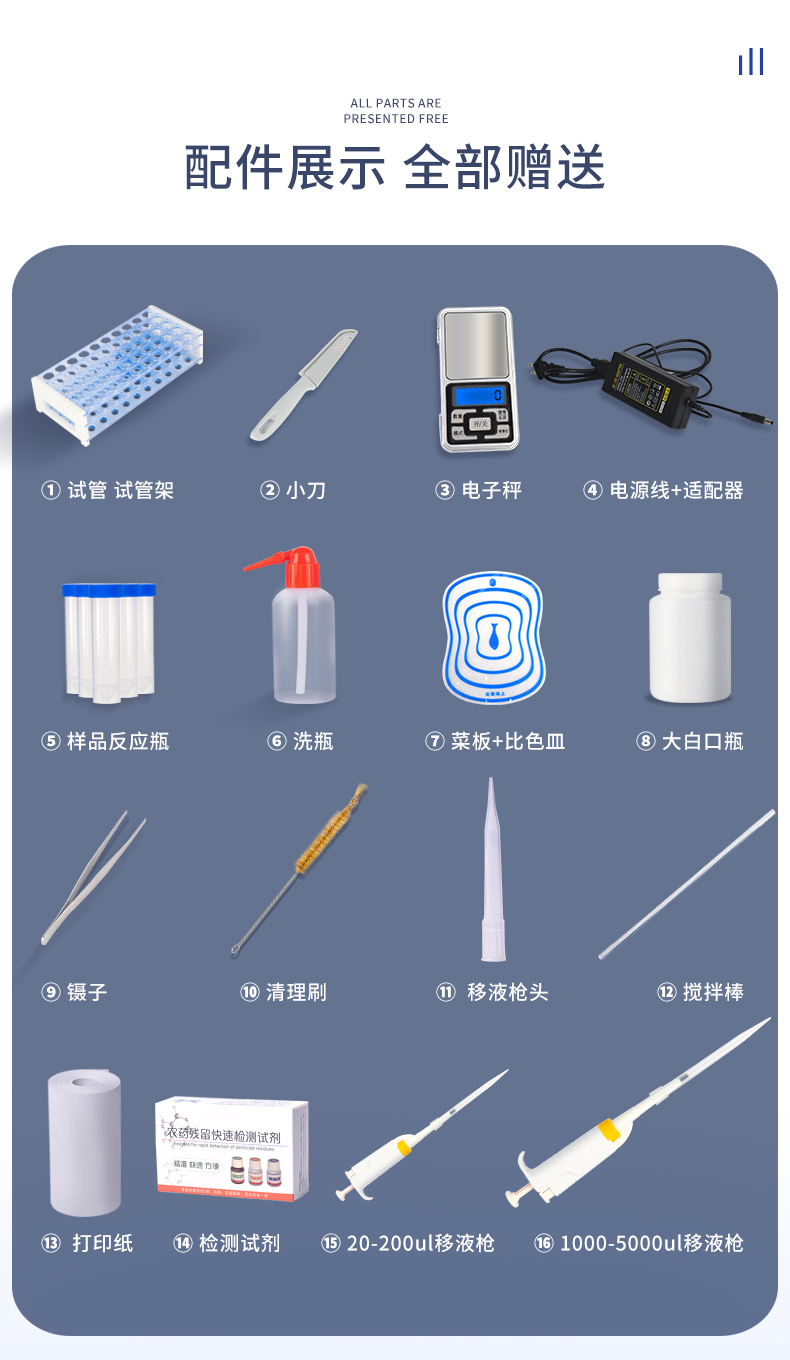 檢測標(biāo)準(zhǔn):依據(jù)國家標(biāo)準(zhǔn)方法(GB/T5009.199-2003)以及世界衛(wèi)生組織WHO、世界糧農(nóng)組織FAO殘留農(nóng)藥檢測標(biāo)準(zhǔn)、世界環(huán)境保護(hù)局EPA參照攝入量等要求來設(shè)計(jì)。采用酶抑制率比色法對水果、蔬菜等農(nóng)林產(chǎn)品中有機(jī)磷和氨基甲酸酯類農(nóng)藥含量進(jìn)行快速準(zhǔn)確的檢測。