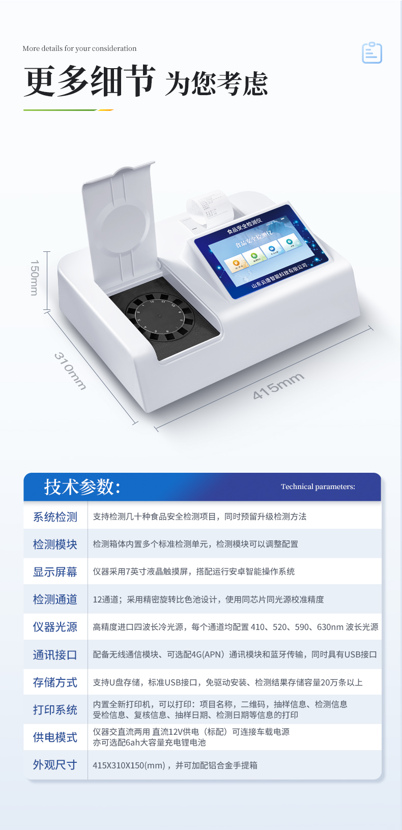 高精度食品安全檢測儀可快速檢測60多項(xiàng)目,包含:濫用食品添加劑、非食用化學(xué)物質(zhì)、農(nóng)藥殘留、重金屬含量、病害肉成分、營養(yǎng)強(qiáng)化劑、化學(xué)類殘留、食用油脂檢測、水酒飲品分析、調(diào)味品成分、食用色素等現(xiàn)場的定性定量檢測。