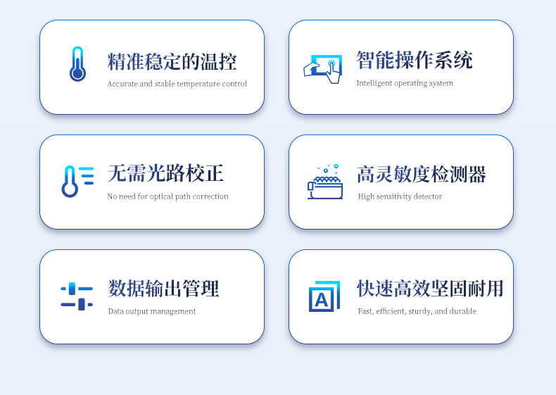 | 1.智能操作系統(tǒng),實驗盡在掌握 | A程序更新與預(yù)設(shè):支持在線更新實驗程序,并內(nèi)置豐富的預(yù)設(shè)實驗程序模板,用戶亦可自定義保存常用模版,實現(xiàn)一鍵快速啟動,極大提升操作效率。 | B極簡啟動體驗(可選配):可定制集成攝像頭掃描系統(tǒng),用戶只需掃描樣品板或程序卡的二維碼,即可自動識別并調(diào)用對應(yīng)實驗程序,簡化流程,避免人為設(shè)置錯誤。 | C操作簡單:觸摸屏界面設(shè)計得直觀易懂,新用戶也能快速上手。預(yù)置常用程序模板,進(jìn)一步簡化操作流程。 | 2.精準(zhǔn)穩(wěn)定的溫控與光學(xué)核心 | A長久精準(zhǔn)的溫控系統(tǒng):采用進(jìn)口***TEC半導(dǎo)體制冷模塊,控溫精準(zhǔn)(±0.1°C),孔間溫度均勻性**(≤±0.3°C)。系統(tǒng)穩(wěn)定性卓越,長期使用性能衰減小,校準(zhǔn)周期長達(dá)數(shù)年,顯著降低維護(hù)成本與運(yùn)營中斷。 | B免維護(hù)的靈敏光學(xué)系統(tǒng):配備2個獨(dú)立LED光源與2個獨(dú)立光電二極管檢測器,實現(xiàn)雙通道熒光同步精準(zhǔn)檢測。采用超長壽命進(jìn)口光源,設(shè)計壽命期內(nèi)免維護(hù),無需額外校準(zhǔn)或更換,保障檢測結(jié)果長期一致性與高靈敏度。 | C卓越的數(shù)據(jù)質(zhì)量:實驗線性相關(guān)性高(R2≥0.999),重復(fù)性優(yōu)異(孔間CV值低),確保定量結(jié)果準(zhǔn)確可靠,數(shù)據(jù)置信度高。 | 3.**便捷的數(shù)據(jù)與輸出管理 | A多重數(shù)據(jù)導(dǎo)出方式:支持通過USB存儲設(shè)備直接拷貝,或經(jīng)由Wi-Fi無線網(wǎng)絡(luò)傳輸數(shù)據(jù)至本地服務(wù)器或云端,方便靈活,滿足各類實驗室數(shù)據(jù)管理習(xí)慣。(可選配) | B豐富的報告導(dǎo)出與打印:支持生成并導(dǎo)出多種格式(如PDF、Excel)的實驗報告。儀器兼容USB熱敏打印機(jī)、藍(lán)牙無線打印機(jī)及常規(guī)A4打印機(jī),可直接在儀器上或通過電腦一鍵導(dǎo)出并打印專業(yè)報告,便于結(jié)果存檔與即時分享。 | 4.快速**與堅固耐用 | A升降溫速度快:優(yōu)化設(shè)計的溫控系統(tǒng)具備高速升降溫能力,顯著縮短單次循環(huán)與整體檢測時間,提升實驗通量。 | B超長使用壽命:核心部件均選用工業(yè)級耐用材料與設(shè)計,整機(jī)運(yùn)行穩(wěn)定可靠,致力于為用戶提供長久的投資回報。 |